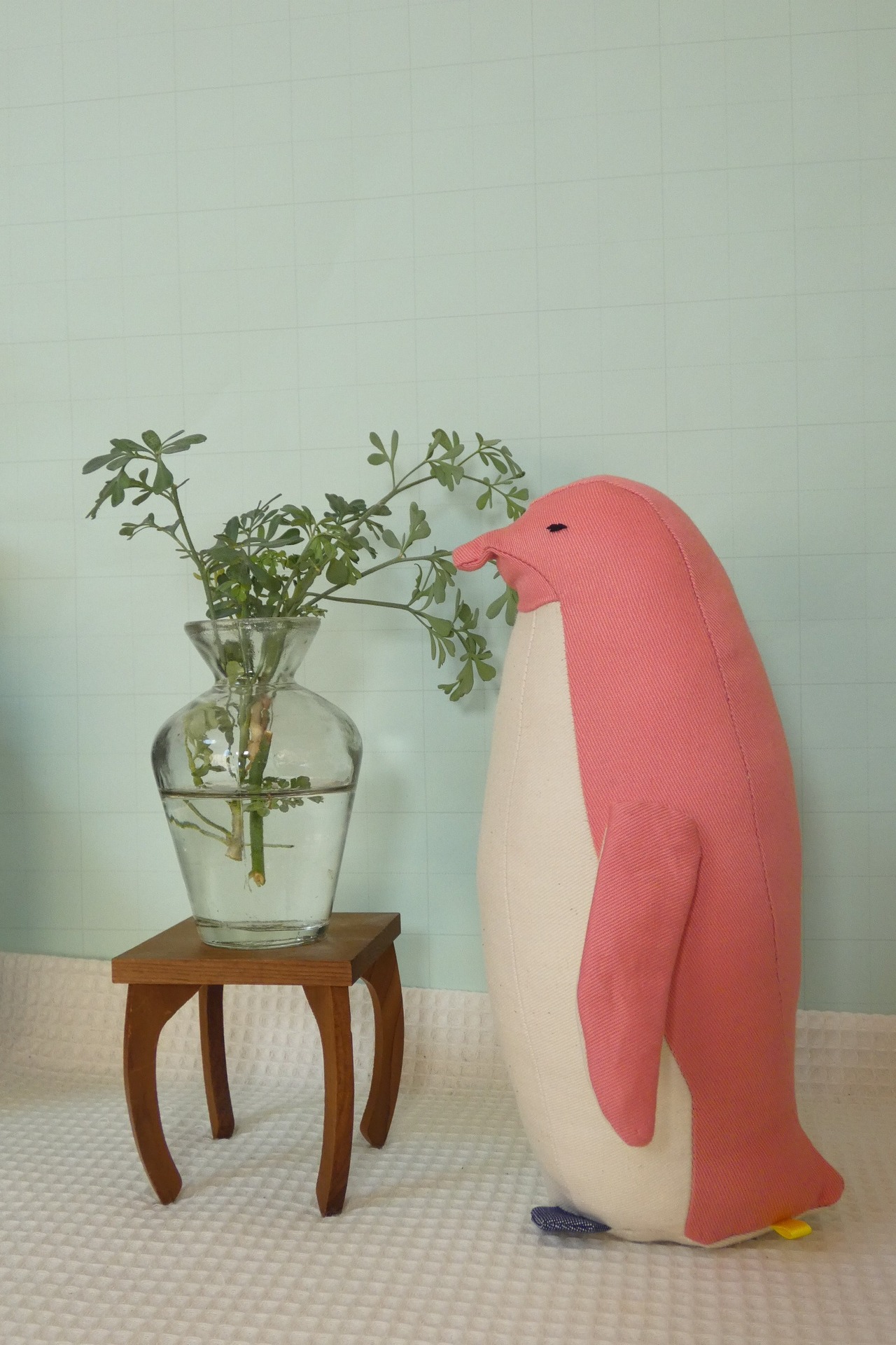 目は刺繍です。下の方に重し(プラスチックビーズ)が入っているので自立しますが、重心が高いので安定感はそこそこです。